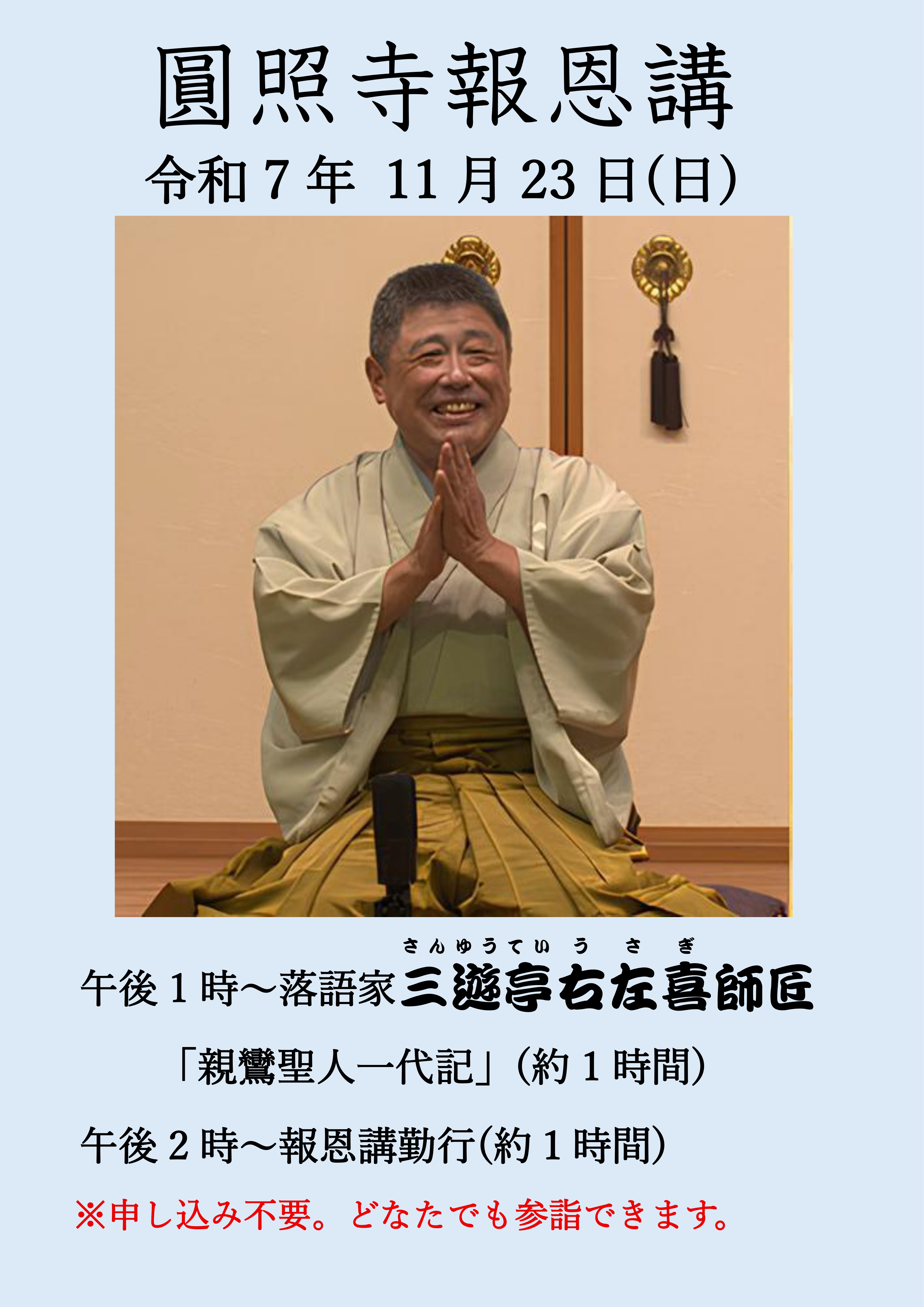 ハロウィン一色だったスーパーの陳列も気付けばにクリスマスやお歳暮商品が並びはじめ、あっという間に10月が過ぎ去ろうとしています。今年も報恩講が近づいてまいりました。今年は落語家の三遊亭右左喜師匠をお迎えし、「親鸞聖人一代記」を講演していただきます。
