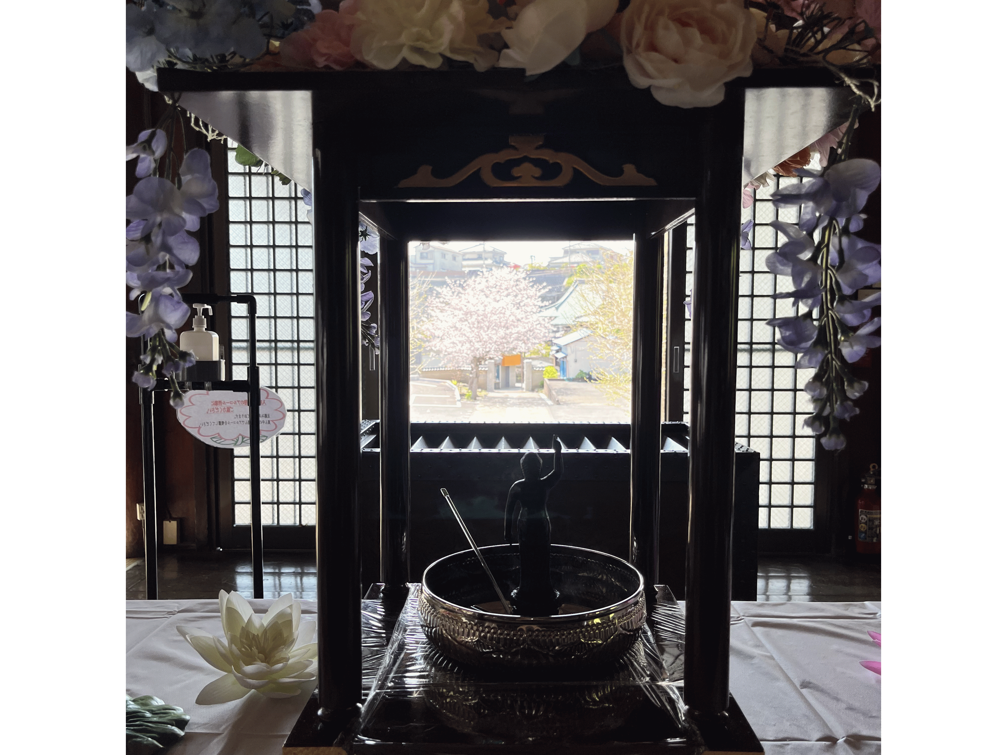 本日は、4月8日。お釈迦様の誕生日です。仏教では、お釈迦様の誕生日を花祭りといいます。”お釈迦様が花園でお生まれになってすぐ数歩歩み、右手で天を指し、左手で地をお指しになり「天上天下唯我独尊」とおっしゃりました。そこへ天から誕生を祝う甘露が降った”という逸話を元に、その時の姿を模した誕生仏に甘茶をおかけしてお祝いをいたします。毎年花祭りの時期に正門の桜が満開を迎えます。毎年、本堂から桜を眺め、お釈迦様がお生まれになった花園に思いを馳せています。私にとって特別な眺めとなっています。ぜひ本堂にお参りの際は、誕生仏に甘茶をおかけして本堂からの桜を楽しんでみてください。花御堂は明後日までお飾りしております。